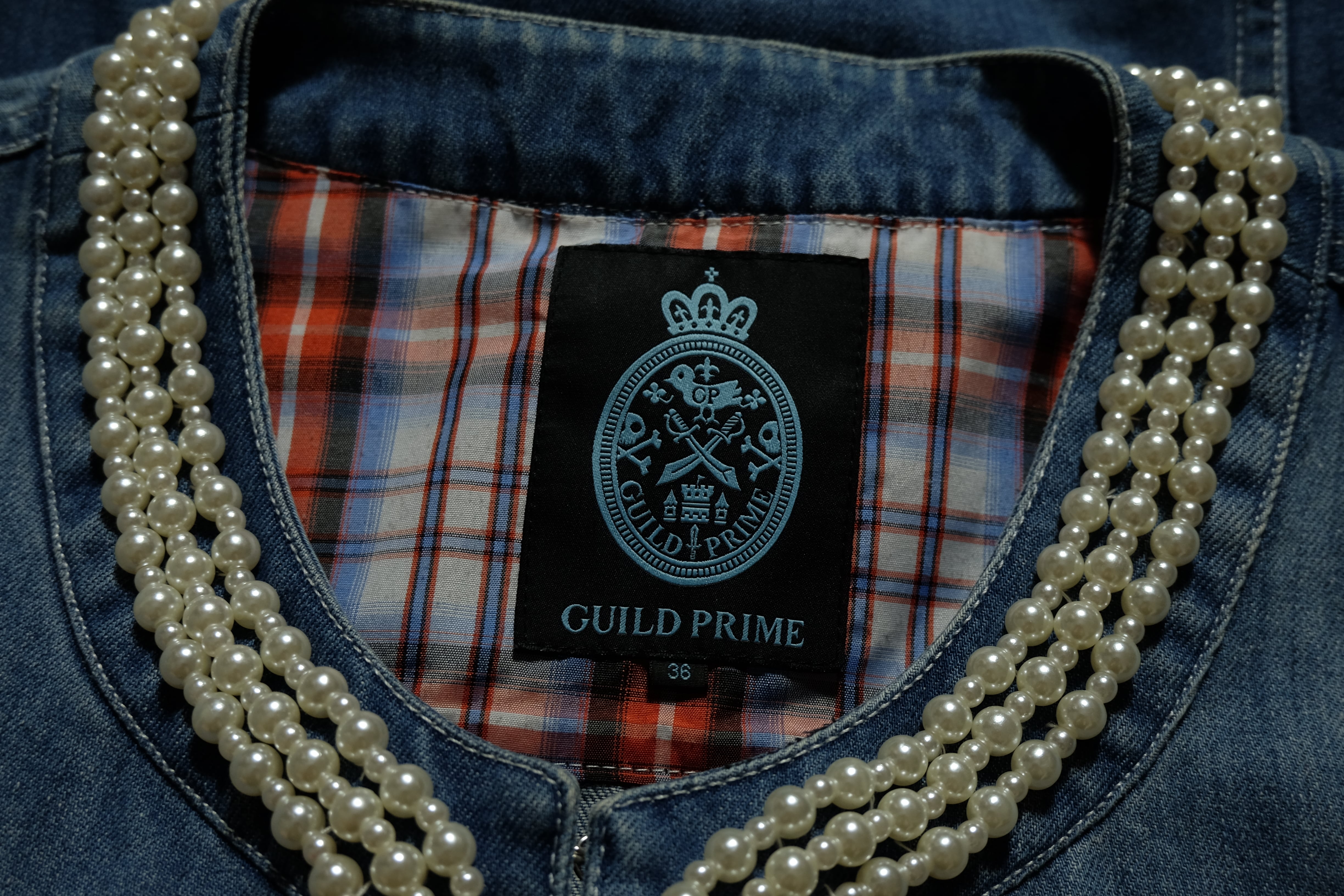 vintage used clothing guild prime pearl design denim no-collar jacket ヴィンテージ ユーズド 古着 ギルドプライム パール ノーカラー デニム ジャケット デザイン モード